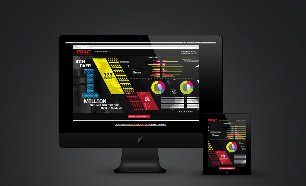 A responsive, horizontal-scrolling landing page displaying designed information on 1 million worldwide users taking their GNC Protein Number.